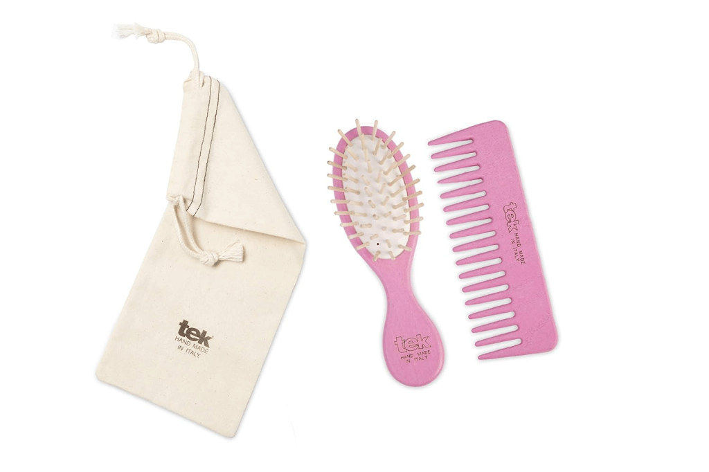 This travel-friendly set comes with a small wooden brush, small wooden comb, and travel bag. The brush and comb are made with 100% FSC®-certified ash wood, and the pouch is organic cotton. They are hand sanded and treated with carnauba vegetable wax and linseed oil. The wood is harvested form sustainable forests, and Tek only uses natural rubber. Plus, product packaging is plastic-free and made with recycled cardboard.
